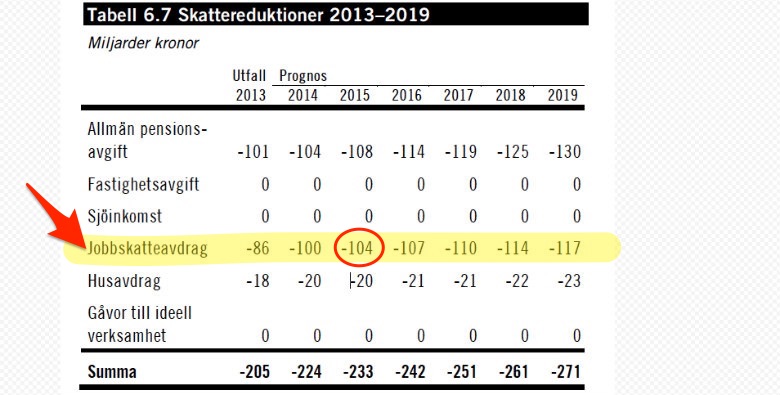 Skatteavdraget, som i teknisk mening är en reduktion, kan man läsa i tabellen kostar statskassan 104 miljarder kronor bara i år. Nästa år kostar det 107 miljarder kronor, året därpå 110 miljarder och så vidare.
