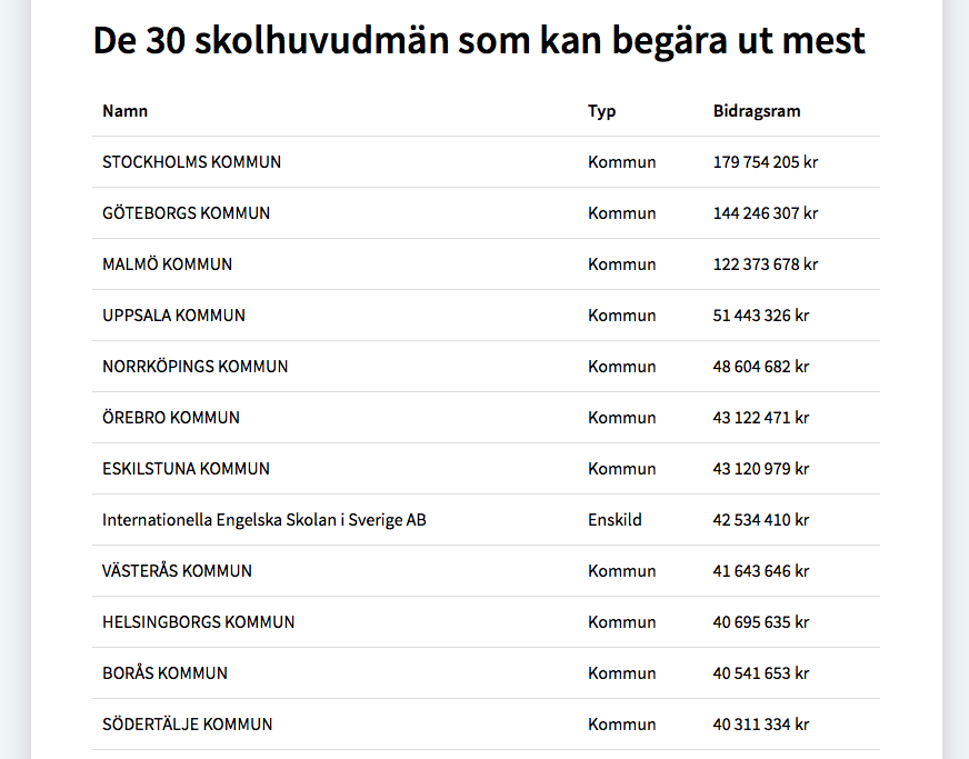 Men ingen kommun eller skolhuvudman blir helt utan pengar – även om spännvidden i storlek på bidrag per huvudman sträcker sig från några ynka tusenlappar till nästan 200 miljoner kronor för den största kommunen.