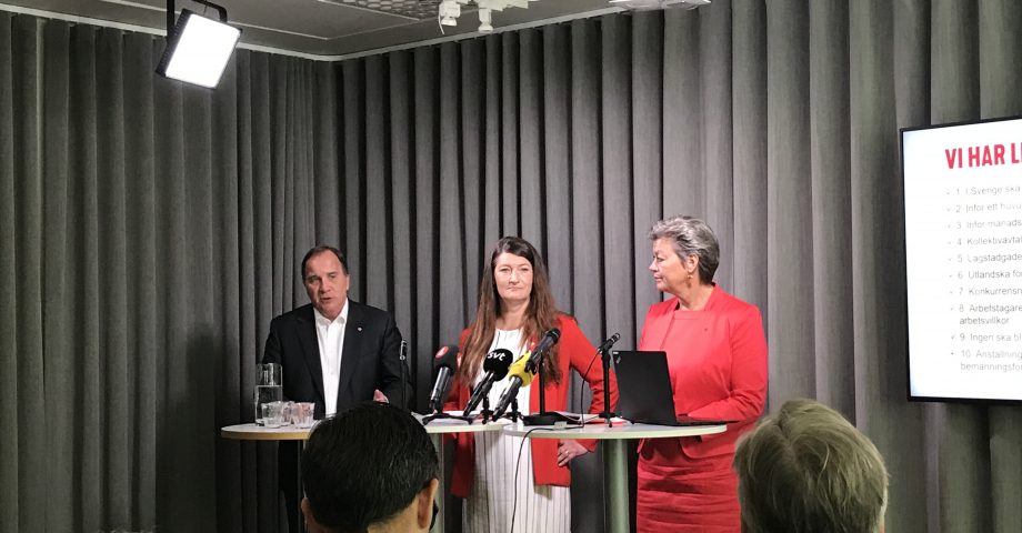 Stefan Löfven, arbetsmarknadsminister Ylva Johansson och Handels ordförande Susanna Gideonsson presenterade på tisdagsförmiddagen en handlingsplan i tio punkter för en trygg arbetsmarknad – ett program som Socialdemokraterna går till val på.