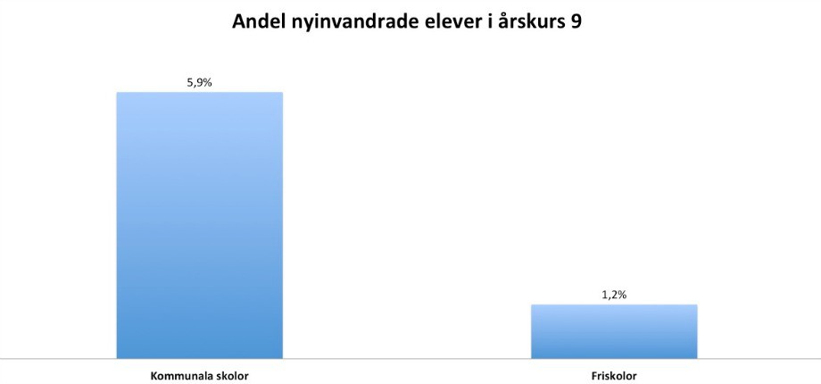 I kommunala skolor är i snitt 5,9 procent av eleverna i årskurs 9 nyinvandrade. I friskolor är motsvarande siffra 1,2 procent.