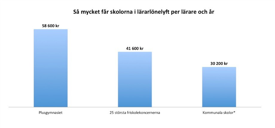 En granskning från Lärarnas tidning visar att friskolelärarna får 7 800 kronor mer per lärare och år. Tittar man på de 25 största friskolekoncernerna är skillnaden ännu större – 11 400 kronor. Och ser man till enskilda friskoleföretag ökar skillnaderna ytterligare. Plusgymnasiet får exempelvis nästan dubbelt så mycket i lärarlönelyft som de kommunala skolorna.