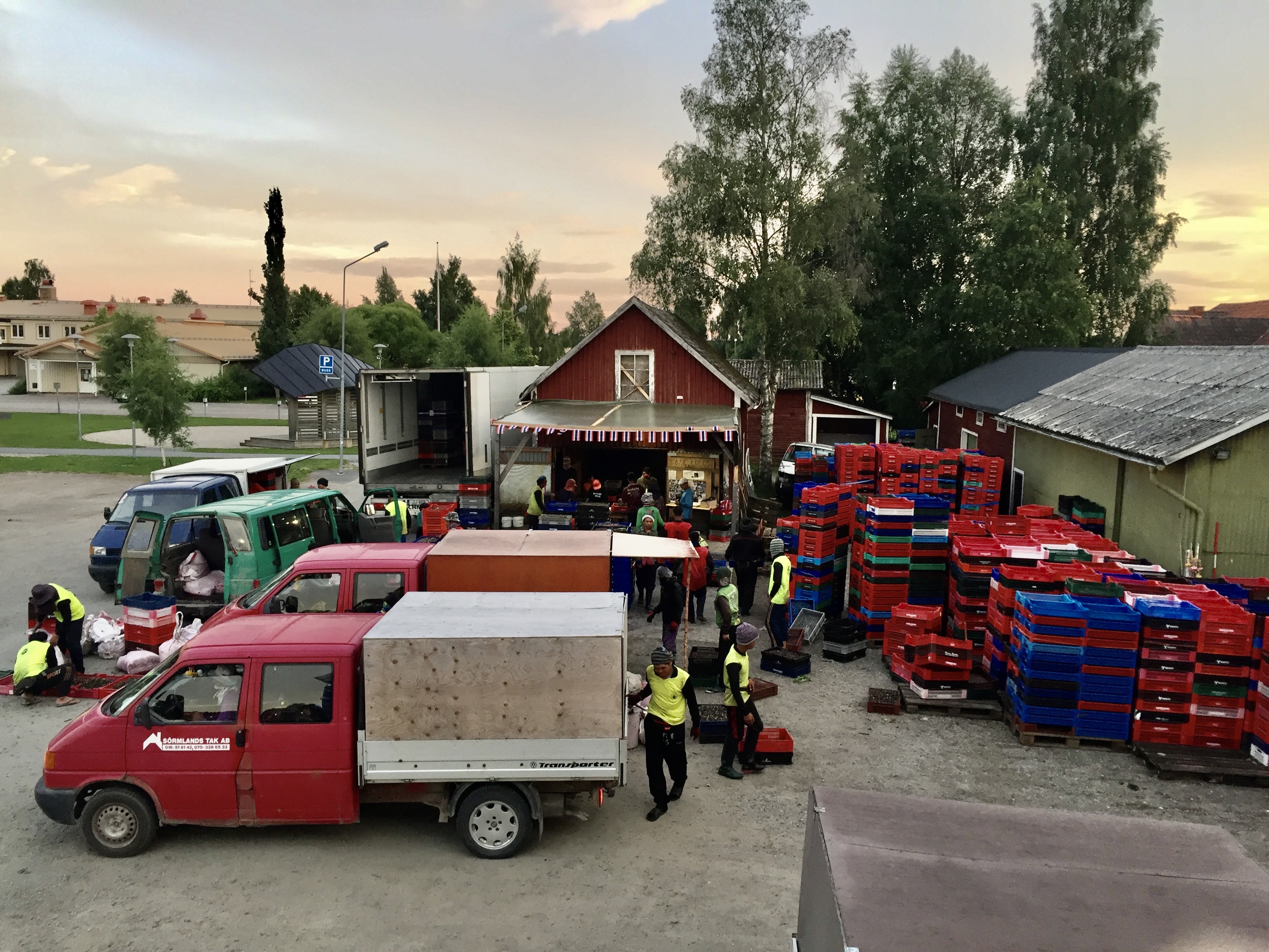 Ur minibussarna lyfter de thailändska bärplockarna rissäckar som de har tagit med sig från Thailand. Nu är säckarna fyllda med blåbär och töms i plastbackar som vägs in. Klockan är halv åtta på kvällen och asfaltsplanen i centrala Junsele i Ångermanland som brukar vara folktom är full av rörelse. Paithoons blå händer grabbar tag om två säckar samtidigt. Den ena bär han på ryggen och den andra framför sig. Han är dödstrött efter dagens arbete, men också nöjd med att ännu en dag ha plockat mer än 120 kilo blåbär. Snart väntar duschen på förläggningen, ett stenkast bort. Imorgon ska han upp i ottan igen, åka med sina kolleger i minibussen och försöka plocka lika mycket bär igen.