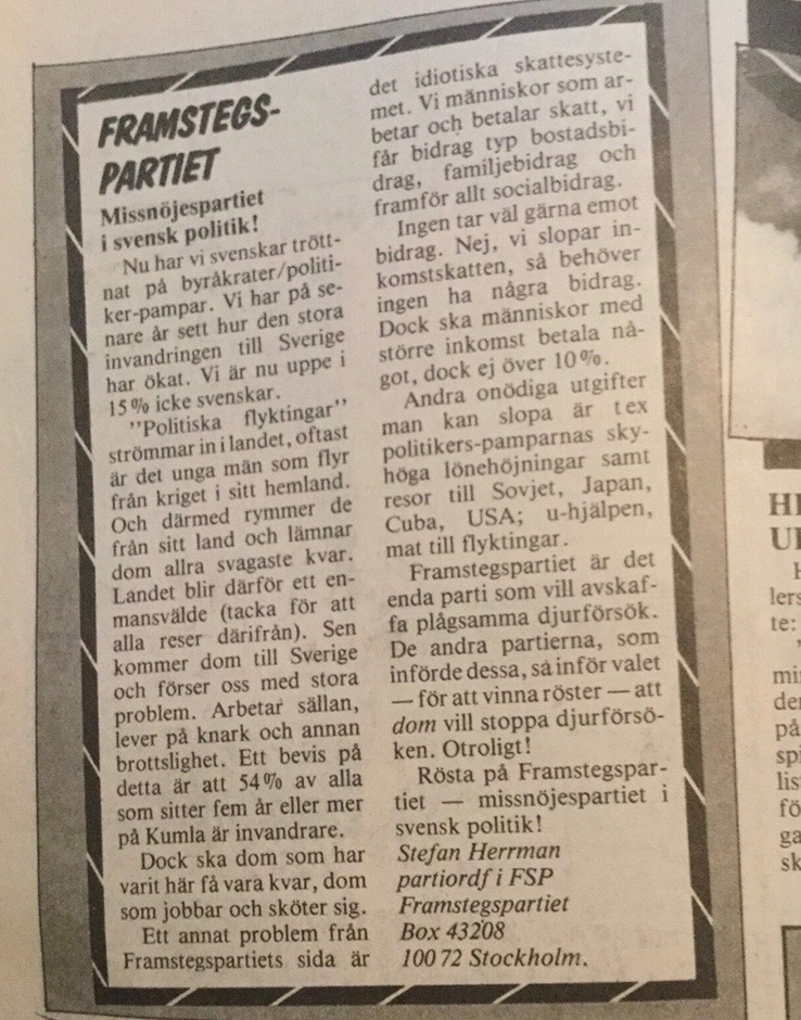 BSS är som bekant en av de organisationer som Sverigedemokraterna uppstått ur. Ett annat parti av betydelse för SDs ursprung är Framstegspartiet, som får publicera en närmast reklamliknande insändare i 1985: