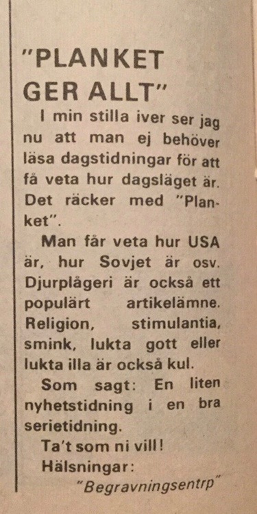 Som sagt, att läsa sjutton årgångar av Klotterplanket är som att få en föraning av vad som komma skulle. Och även om det kan kännas beklämmande att se några av de insändare som publicerades, så är helheten trots allt ändå givande. I en tid då myter om åsiktskorridorer florerar, och det finns en diskussion om att allt inte har fått sägas offentligt i det svenska samhället, blir detta befriande läsning. I dessa spalter återfinns en klar bild av det svenska samhällets alla utmaningar. Och det är till stor del samma frågor än idag.