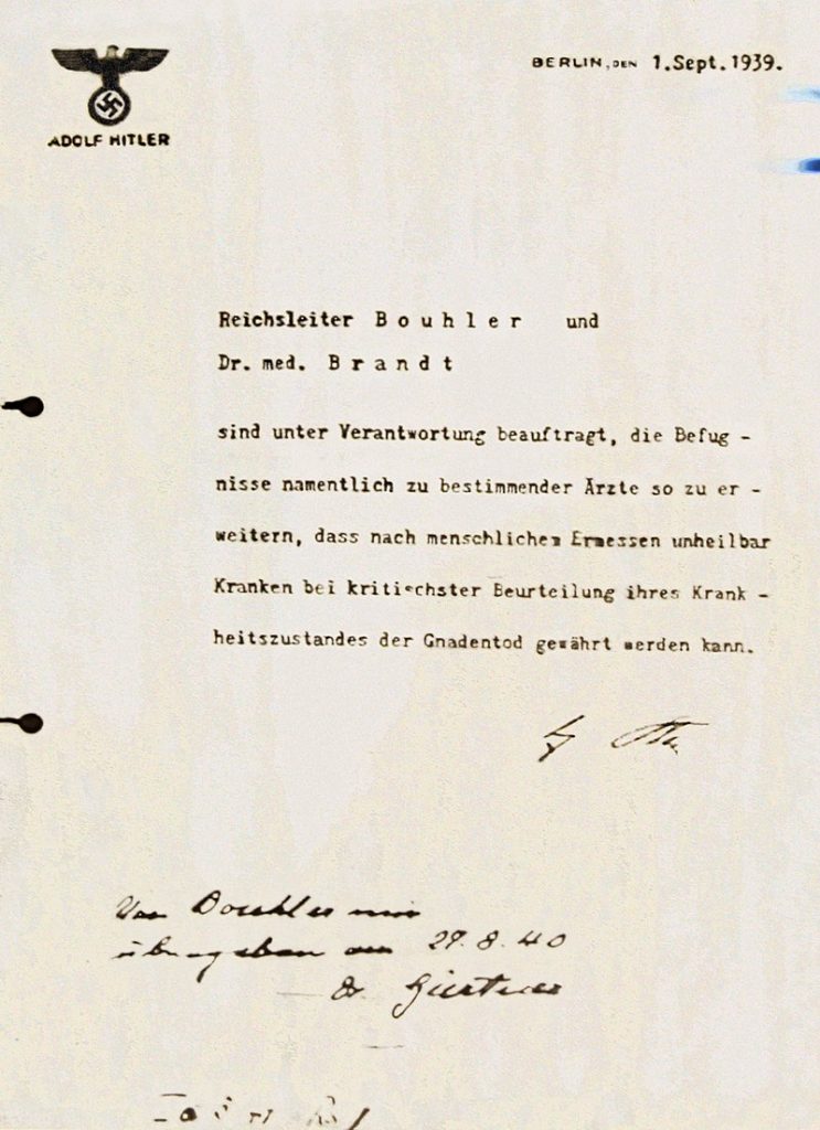 Dekret 1939 från Adolf Hitler om att genomföra programmet för barmhärtighetsdödande. (Wikimedia)