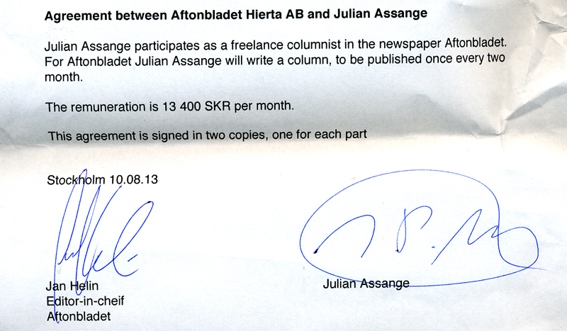 Under några timmar efter lunch var pappersarbetet överstökat. Assange hade lägligt nog fått ett uppdrag som kolumnist på Aftonbladet, som inte varit sent att tacka ja till erbjudandet att få cybervärldens megastjärna som fast medarbetare. Det betydde att Assange kunde visa för Migrationsverket att han hade både fast arbete och en regelbunden inkomst på 13 400 kronor i månaden.