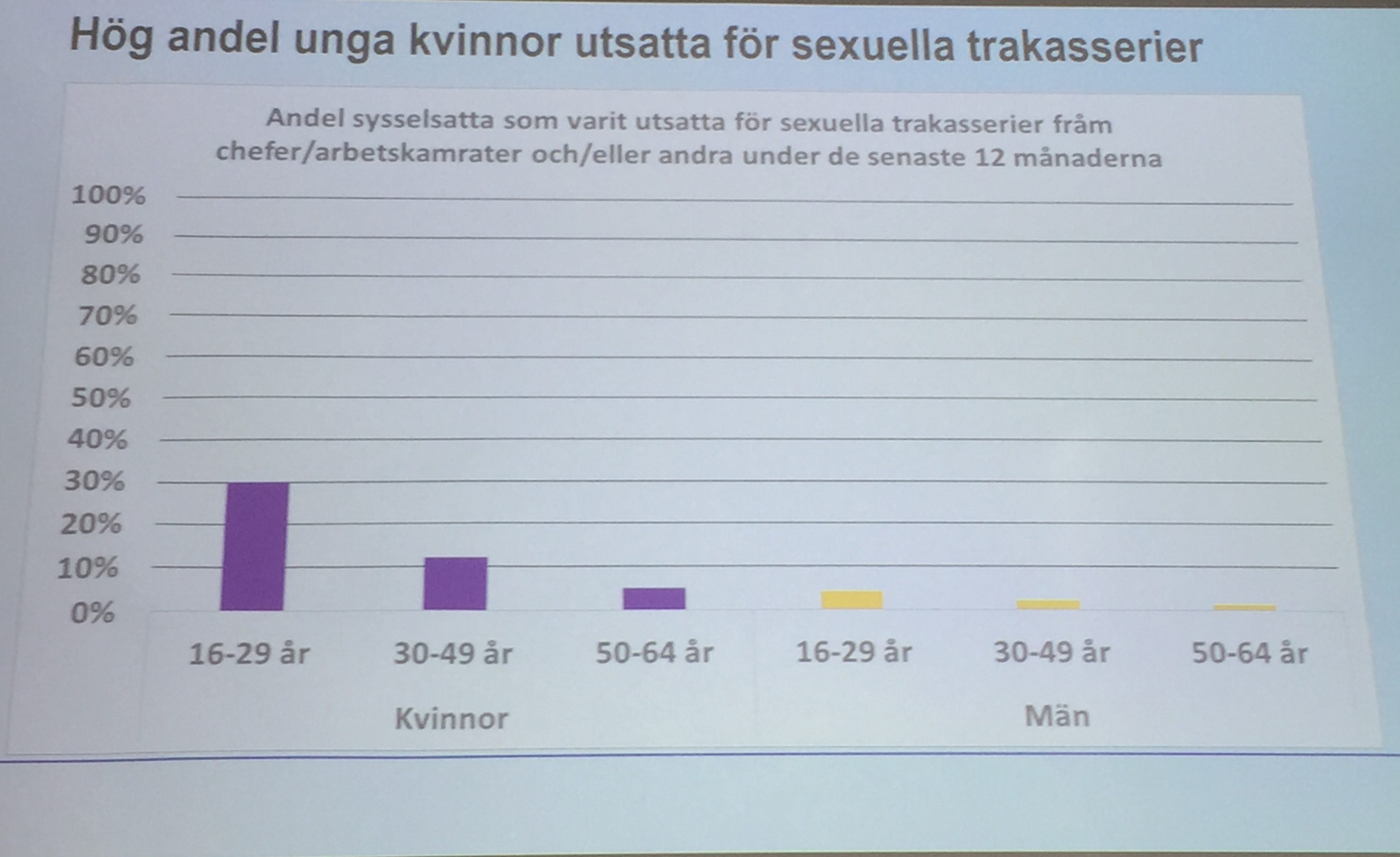 Bland annat uppger var tredje kvinna, 30 procent, i åldrarna 16–29 att de utsatts för sexuella trakasserier av någon kollega, chef, brukare eller kund, de senaste 12 månaderna.