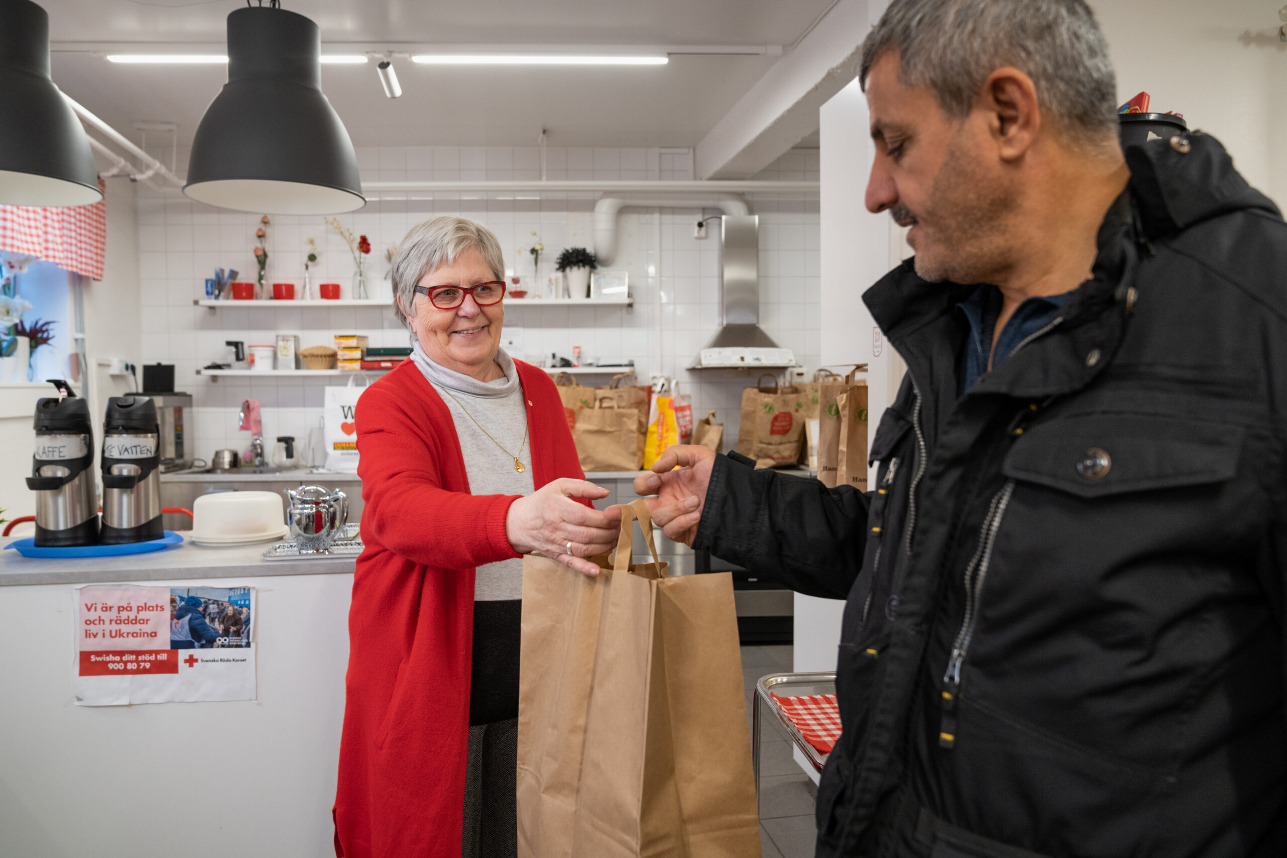 Gunborg Morén är volontär på Röda Korset i Hedemora sedan 1979. För några år sedan började de att dela ut matkassar eftersom kommunen tagit emot många nyanlända. Matkassarna har nu blivit eftertraktade av helt nya målgrupper.