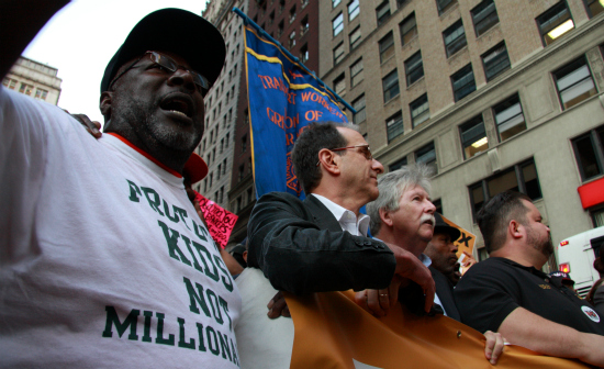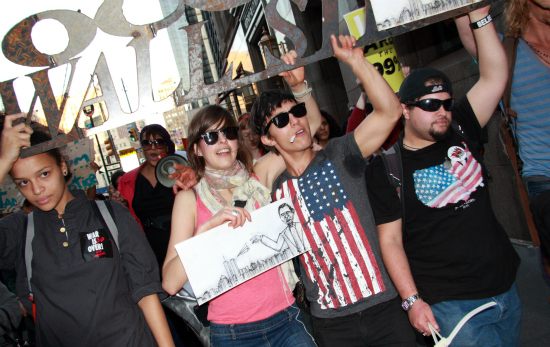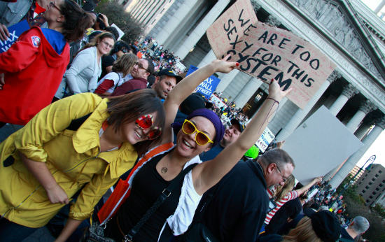 De som normalt sett håller till i de här kvarteren reagerar lite olika på det som händer. Några går framåtlutade med blicken i marken, som gubbar på väg ut från en porrbiograf, medan andra stirrar med öppen mun på den förbipasserande demonstrationen. En fetlagd man i kritstrecksrandig kostym vänder båda händernas långfingrar mot himlen och skriker ”fuck you, you fucking freaks”, medan en ung kvinna i grå kavaj rör sig med folkmassan och håller upp en skylt som det står ”Raise my taxes” på.