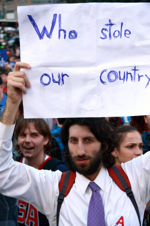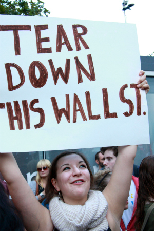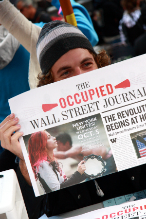 Det är den 5 oktober och Foley Square på södra Manhattan har fyllts av demonstranter som stödjer Occupy Wall Street – aktionen som först ignorerades, sedan förlöjligades, men som nu fått en huvudroll i skapelseberättelsen för en ny rörelse. Budskapen har ritats på plakat som folk sträcker upp mot hösthimlen. Någon undrar vem som stulit hans land. En annan tycker att miljardärer bör betala högre skatt. En tredje att Wall Street ska regleras. En fjärde kör med en ordvits: ”Lost my job, found an occupation”.