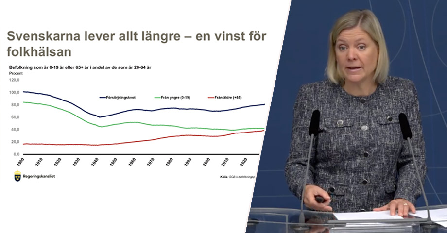 – Livslängden har ökat med 7 år sedan 1980, vi ser nu att av 100 som jobbar finns det 75 som inte gör det och behöver försörjas, säger Magdalena Andersson (S).