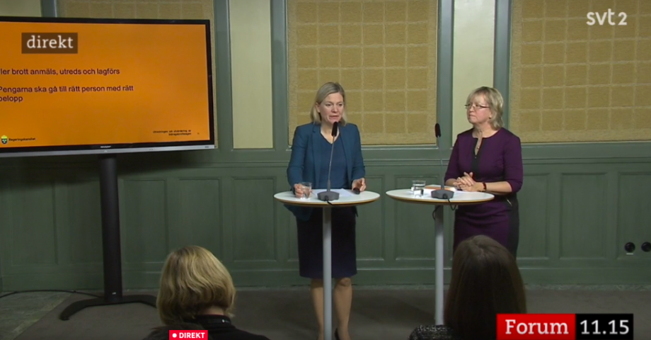 Finansminister Magdalena Andersson (S) tog i dag emot den utredning som tittat närmare på hur väl Bidragsbrottslagen och Lagen om underrättelseskyldighet fungerar. Bidragsbrottslagen har lett till större fokus på bidragsbrott, men trots att lagarna funnits i tio år är implementeringen av framförallt anmälningsplikten bristfällig, menar utredaren Lena Egelin.