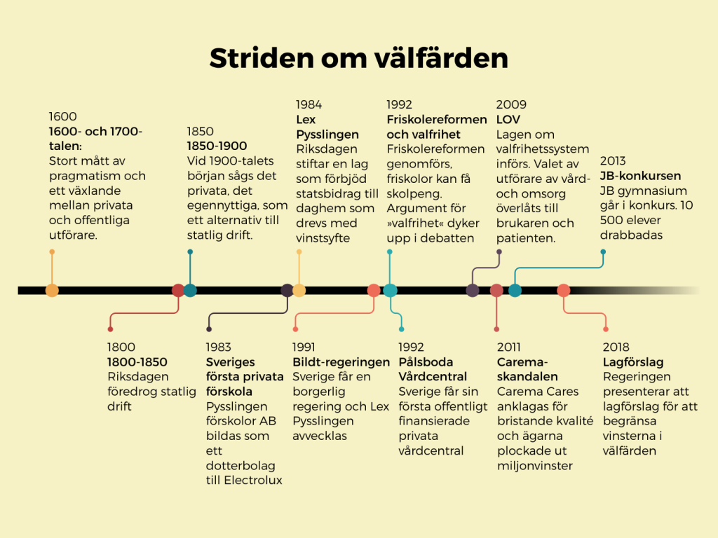 Dessförinnan kom debatten om vinster i välfärden upp i samband med 1984 års etablering av förskolan Pysslingen. Borgliga politiker ville att privata aktörer skulle få verka inom skattefinansierad barnomsorg. Majoriteten av tidens riksdag sa nej och en lag stiftades mot att statsbidrag gick till förskolor som drevs av aktiebolag. Lagen fick smeknamnet Lex Pysslingen.