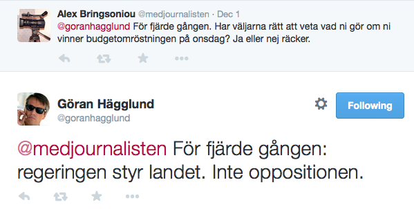 Fredrik Reinfeldt, som faktiskt fortfarande är moderatledare, lämnade en kommentar i början av november. Reinfeldt tycker läget är vore “allvarligt” om regeringen inte får igenom sin budget. Men att göra någonting för att förändra den situation som göra att detta allvarliga läge uppkommer tycker Reinfeldt inte är nödvändigt.