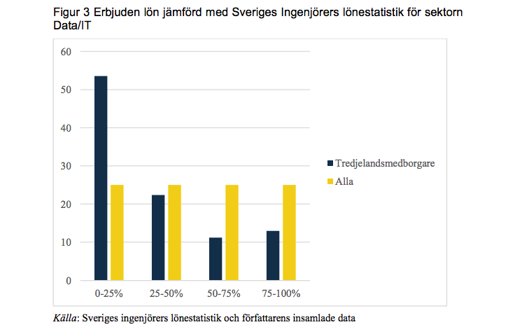 arbetskraftsinvandring Lönerna ligger klart lägre för arbetskraftsinvandrare inom it-sektorn och ingenjörsyrken, än vad den gör för svenskar anställda i samma branscher. Dessutom är skyddet mot lönediskriminering svagt.