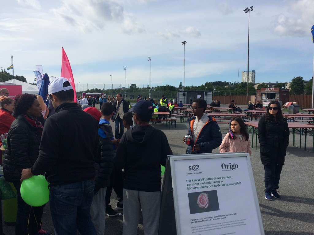 Det är blött på de enkla träbänkarna framför scenen efter ett regn som nyss fallit, och himlen är fortfarande halvgrå. Klockan är nästan fyra och på det inhägnade, asfalterade området på Spånga IP är de få människor som är på plats nästan uteslutande sådana som arbetar på ett eller annat sätt. Som de Fryshuset-anställda ungdomarna med neongula västar, några journalister och, inte minst, de som företräder något politiskt parti eller företag. Många partijackor och ballonger i grälla färger syns kring raderna av små stånd.