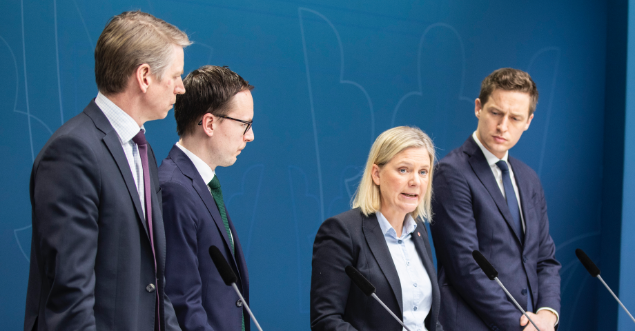 På pressträffen deltar finansminister Magdalena Andersson (S), Emil Källström ekonomisk-politisk talesperson Centerpartiet, Mats Persson ekonomisk-politisk talesperson Liberalerna och finansmarknadsminister Per Bolund. De presenterar en ändringsbudget pågrund av läget i Sverige.