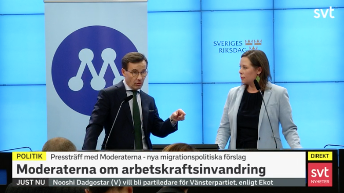 – Många ligger på lägsta lön 13 000 kronor eller lägre. Var tionde saknar helt inkomst året efter att de kom hit som arbetskraftsinvandrare, sa Ulf Kristersson under presskonferensen.