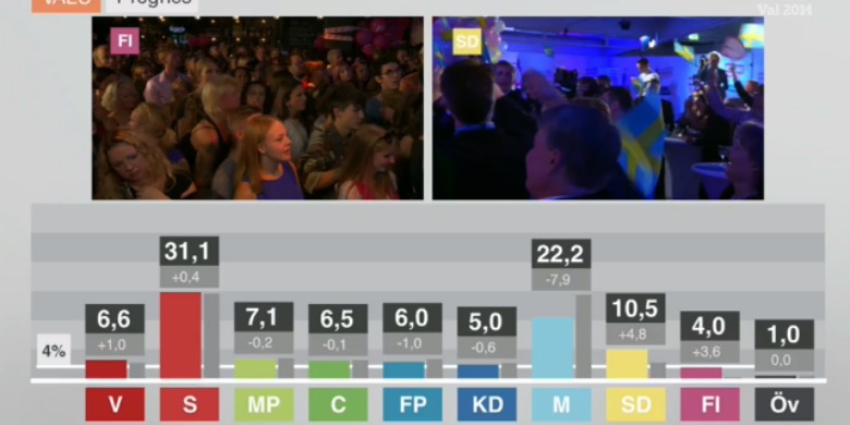 Moderaterna får 22,2 procent och gör därmed en stor förlust jämfört med valresultatet 2010 då partiet fick 30,6 procent. Störst block blir de rödgröna som tillsammans får 44,8 procent av rösterna. Alliansen får totalt 39,7 procent. Enligt SVT:s vallokalsundersökning tar sig även Fi in i riksdagen och får 4 procent. Sverigedemokraterna är enligt undersökningen Sveriges tredje största parti med 10,5 procent av rösterna.