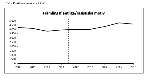 Antalet polisanmälda hatbrott följer även de en relativt plan kurva med en viss ökning mellan 2013 till 2015 för att därefter minska till 2016.