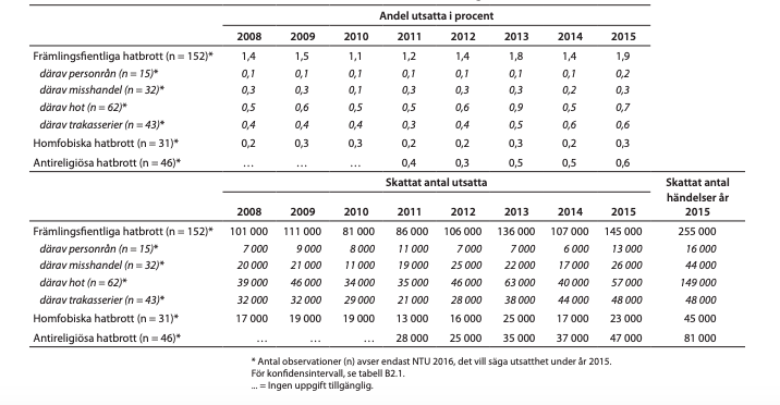 NTU uppskattar att 145 000 människor utsattes för främlingsfientliga hatbrott år 2015. Det är den högsta uppskattningen på nästan tio år, men 2014 års uppskattning landade på 107 000 så variationen mellan år är stor och inte heller statistiskt säkerställd. Skillnaderna mellan år påverkas också av att det är ett förhållandevis litet antal respondenter som svarat att de har blivit utsatta för hatbrott, vilket skapar större osäkerhet i skattningarna.