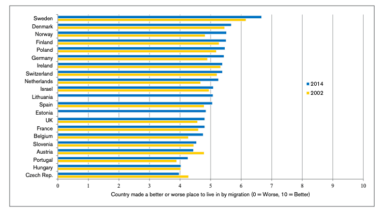 »På grund av de ökade nivåerna av migration i många av de här länderna sedan 2002, och den ökade politiska positioneringen i migrations frågan, hade vi förväntat oss att attityderna skulle ha blivit mer negativa. Dock var det inte det vi fann. Som figur 1 visar, på ett övergripande plan, har den europeiska befolkningen blivit lite mer positiva, inte negativa, till den påverkan migrationen har på deras samhällen«.