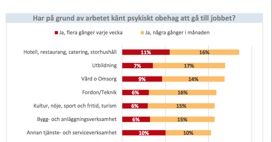 När det gäller olika yrken så är hotell- restaurangbranschen, utbildning och vård och omsorg de sektorer där flest anställda upplever psykiskt obehag inför jobbet.