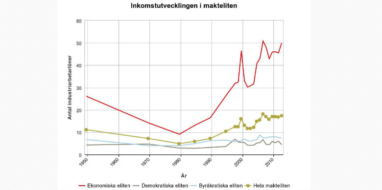 Inkomstklyftan mellan det som LO definierar som ”makteliten” och en vanlig industriarbetare ligger på historiskt höga nivåer, visar den senaste rapporten i LO:s serie. Endast med en liten marginal var ojämlikheten större år 2007, annars är det senaste uppmätta året, 2013, det ojämlikaste sedan mätningarna startade år 1950.