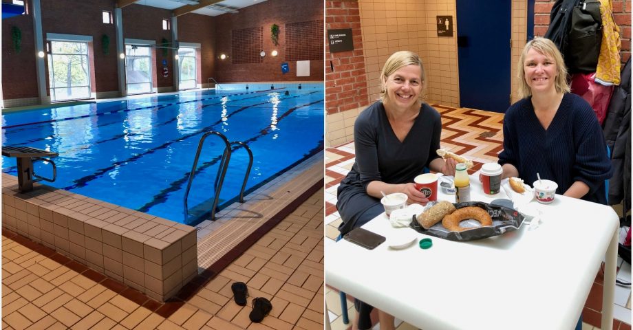 Vi, min simkompis Ulrika och jag, nickar instämmande. Vi sitter invid äventyrspoolen i Husbybadet och äter frukost som vi nyss varit och köpt på ICA. En bit bort, under en gul dinosauries glada uppsyn, kör en grupp morgonyoga. Det här är en oväntat lyckad avslutning på vårens projekt att besöka Stockholms stads samtliga simhallar.