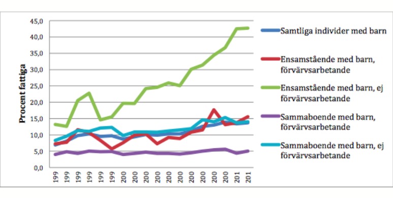 Nästan tre gånger fler barn befann sig i fattigdom 2011 jämfört med 2005 och siffrorna visar tydligt att det är ensamstående med barn och utlandsfödda som drabbas värst. 43 procent av ensamstående med barn utan jobb lever i fattigdom. Det är tre gånger mer än bland samboende föräldrar utan jobb.
