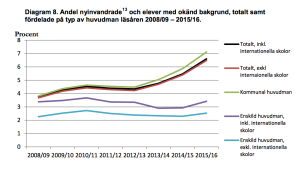 Det fanns 3,8 procent nyanlända elever och elever med okänd bakgrund i de kommunala skolorna 2008. Hösten 2015 hade andelen stigit till 7 procent.