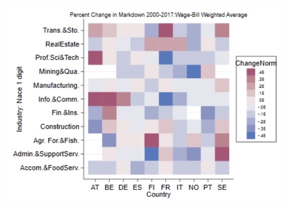 Rödfärgade rutor i diagrammet nedan innebär att skillnaden mellan marginalproduktivitet och lön har ökat sedan millennieskiftet och blåfärgade rutor innebär att skillnaden har minskat. Om vi fokuserar på enskilda länder (vertikalt i diagrammet) ser vi till exempel att Sverige har fem rödtonade branscher, det vill säga branscher där arbetsgivarmakten har ökat. En av dessa är industrin. I gruvindustrin tycks lönesättarmakten i stället vara oförändrad. I förhållande till Finland, men kanske framför allt i förhållande till Norge, har arbetsgivarmaktens utveckling varit mer negativ i Sverige. Detsamma gäller för Sverige relativt Tyskland.
