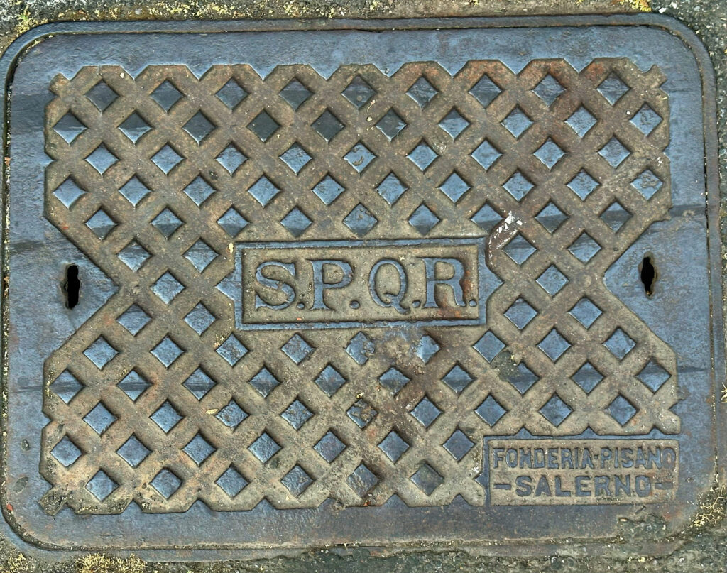 SPQR: ett antikt kontrakt mellan folket och de styrande, här på en modern avloppsbrunn i Rom. Foto: förf.