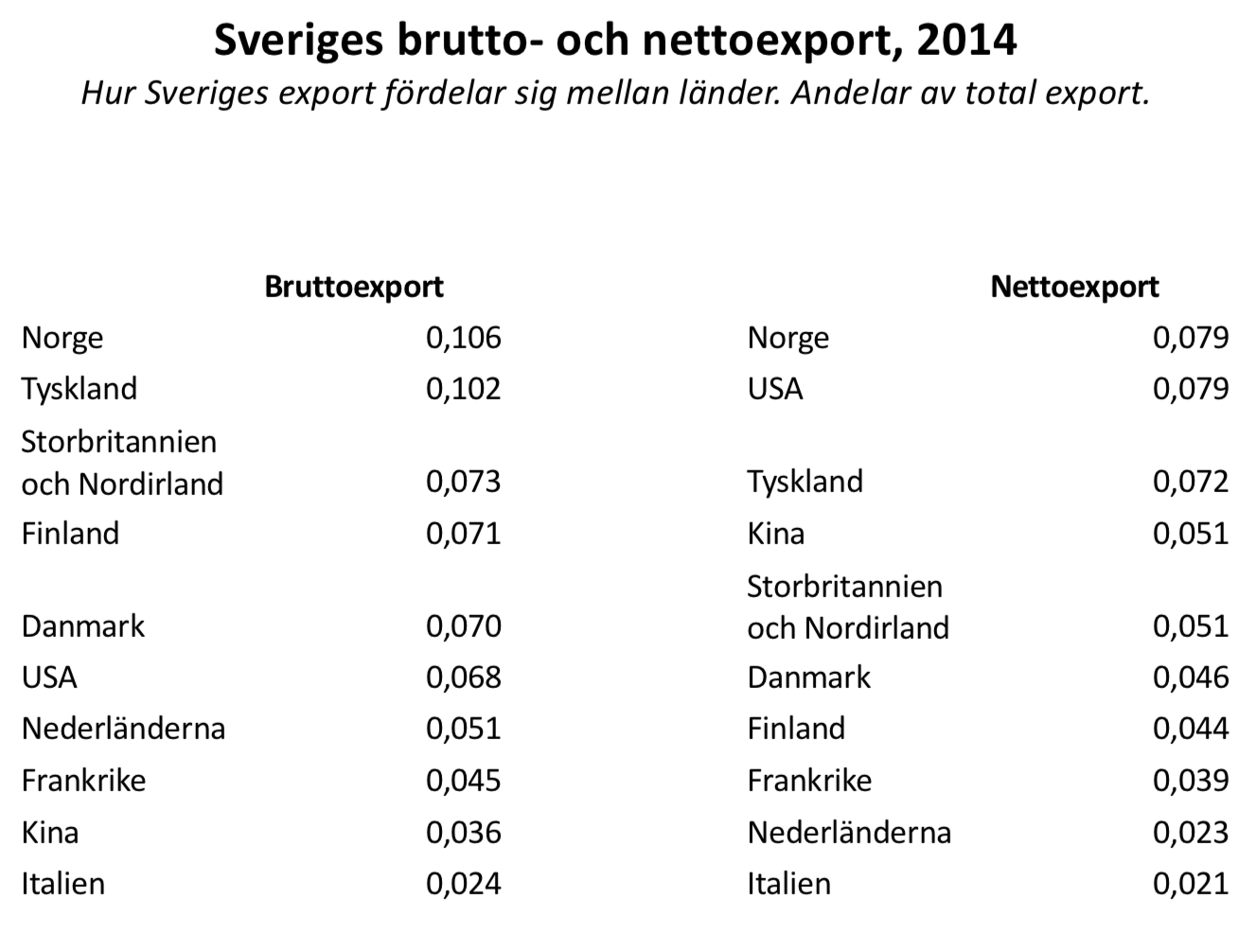 - När exporten mäts i termer av genererade löner och vinster istället för med bruttometoden stiger USA från sjätte till en med Norge delad första plats på listan över Sveriges viktigaste exportmarknader. Kina hamnar på fjärde istället för på nionde plats.