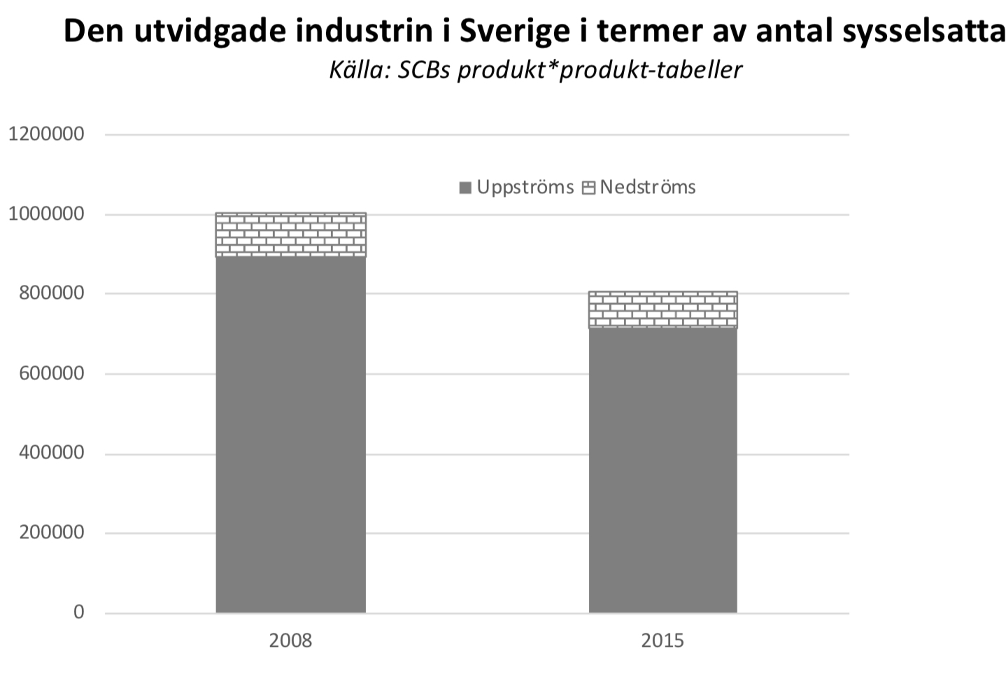 - Den utvidgade svenska industrin – summan av uppströms och nedströms sysselsättning – uppgår i dag till 810 000 sysselsatta. Det är en minskning med 200 000 medarbetare sedan 2008. Den utvidgade industrin utgör 17 procent av sysselsättningen i ekonomin, en minskning med fem procentenheter sedan finanskrisen.