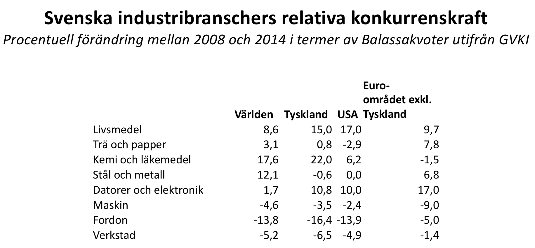 - I relation till USA har den branschvisa konkurrenskraften stärkts för livsmedel, datorer/elektronik och kemi/läkemedel, men för fordonsindustrin har konkurrenskraften påtagligt försämrats.
