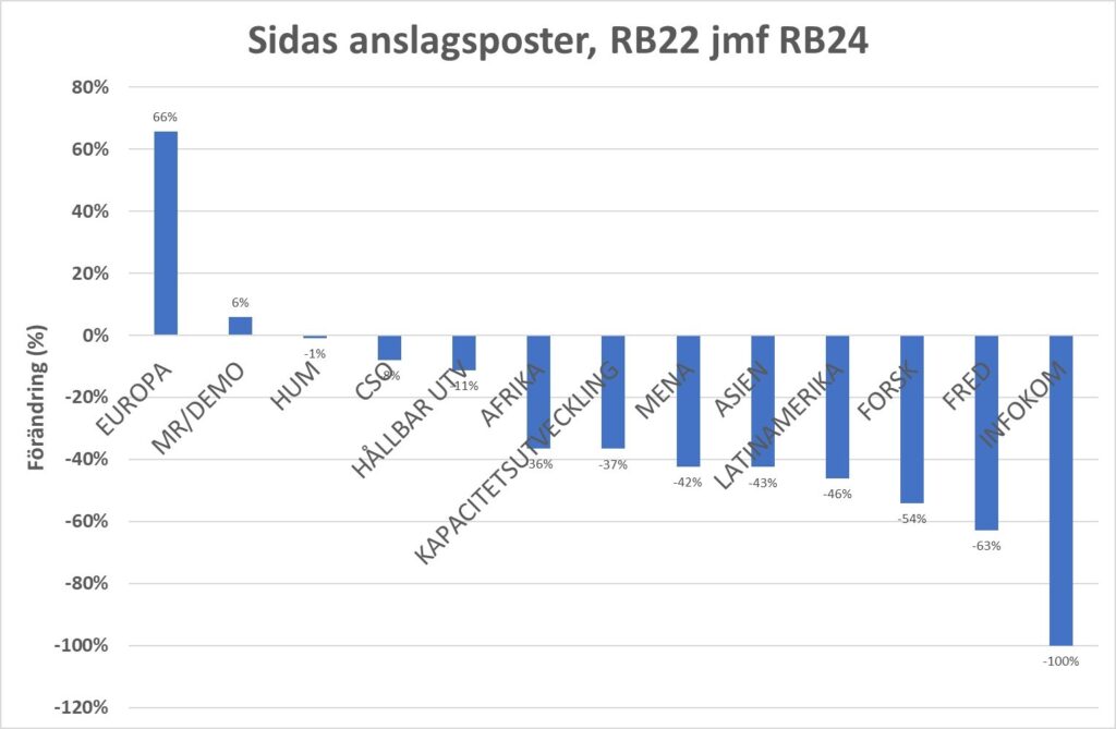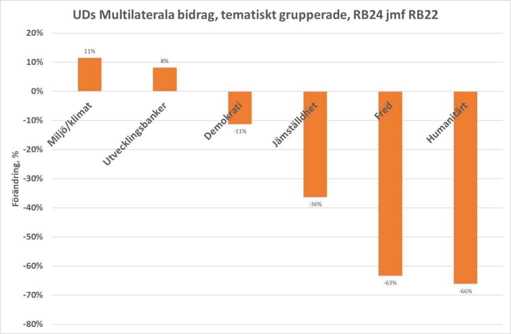 Diagram 1 och 2 nedan visar den procentuella förändringen av olika anslagsposter (nominella belopp), där Regleringsbrevet för 2022 (den förra regeringens sista) jämförs med Regleringsbrevet 2025, som kom precis före jul. Diagram 1 avser Sidas anslag och Diagram 2 de multilaterala bidragen (ap 32 och 32, cirka hälften av biståndsbudgeten) som beslutas direkt av regeringen. För överskådlighetens skull har de många multilaterala bidragen sammanförts tematiskt.