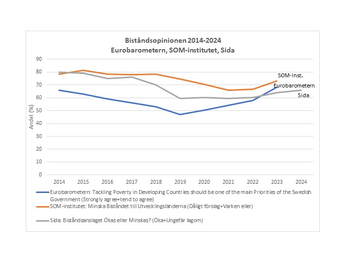 I Diagram 3 jämförs tre undersökningar som regelbundet mäter biståndsviljan i Sverige: SOM-institutet (”bra förslag att minska biståndsanslaget?”), Sida (”bör biståndsanslaget öka/minska?”) samt Eurobarometern (”tackling poverty in developing countries should be one of the main priorities of the Swedish Government”).