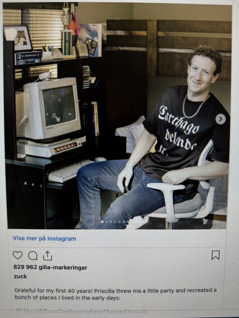 Jag har nyligen avhandlat den obesvarade kärlek och alarmerande okunskap om antiken hos en annan techmogul, Elon Musk. Zuckerberg har en något mer sofistikerad kärlek för antiken, men endast i jämförelse med Musk. Medan Musk gillar att posta ut latinska sentenser på plattformen X bär Zuckerberg dem på tröjor för att bli fotograferad i dem. (Zuckerberg har ett förflutet i att förmedla meddelanden genom kläder, han sägs ju vara ansvarig för att hoodies och liknande blev den klädsel som riskkapitalister letar efter inom tech startups.) På bilder tagna i samband med hans 40-årsdag, i maj 2024, bar han en tröja med devisen Carthago delenda est – Kartago måste förstöras.
