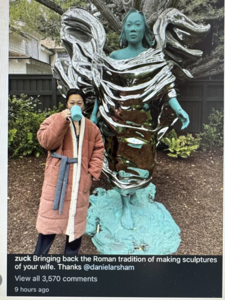 Förutom dessa skärmytslingar på latin så tar sig Zuckerbergs intresse för Rom och imperium även andra uttryck. Hans tre barn lär enligt källor heta Maxima, August och Aurelia, de hålls föredömligt nog utanför offentligheten. Vidare skänkte han sin fru Priscilla Chan (Priscilla är för övrigt ett utmärkt romerskt namn) en staty av henne själv, med motiveringen att han ville återuppliva “the Roman tradition of making sculptures of your wife”. Bilden som han själv lade ut i social medier visar en nyvaken Chen som står bredvid en enorm blå sak, med en kopp kaffe i handen. Statyn, även om den har realistiska drag, är inte antikiserande.