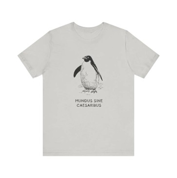 Det är dock inte en antik fras, utan vi är alltjämt inne i någon slags pseudoantikvitet, jag upplever att frasen klingar efterantikt. (Ett mer klassiskt klingande skulle kunna vara orbs instället för mundus, och jag hoppas nu att en massa arga latinister mailar mig mothugg.) Denna tröja är oftast gjord i samma utförande som Zuckerbergs, och finns att köpa på många ställen. Motivet har även vidareutvecklats i ljuset av den senaste tiden, bland annat finns en variant med en pingvin, eftersom pingviner blivit en symbol för protest mot Trumps autokratiska tariffer. (Det är eftersom Heard- och McDonaldöarna, som befolkas av mestadels pingviner, beslogs med importtullar i april 2025.)