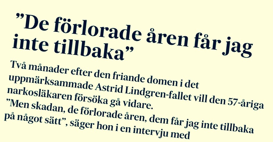 Men narkosläkaren var exkommunicerad, bannlyst, och frikändes först efter två och ett halvt års svårt socialt lidande, som inte upphörde med den friande domen. Skadan var redan skedd. Den helt oskyldiga läkaren fick inget öppet stöd av sjukhusledning eller kolleger och tvingades lämna Karolinska sjukhuset och flytta till annan stad.
