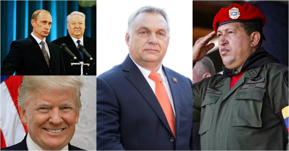 När blir en demokrati något annat? frågar Börje Ljunggren. På bilderna: Vladimir Putin, Donald Trump, Victor Orban och Hugo Chavez. Foto: Wikimedia commons.