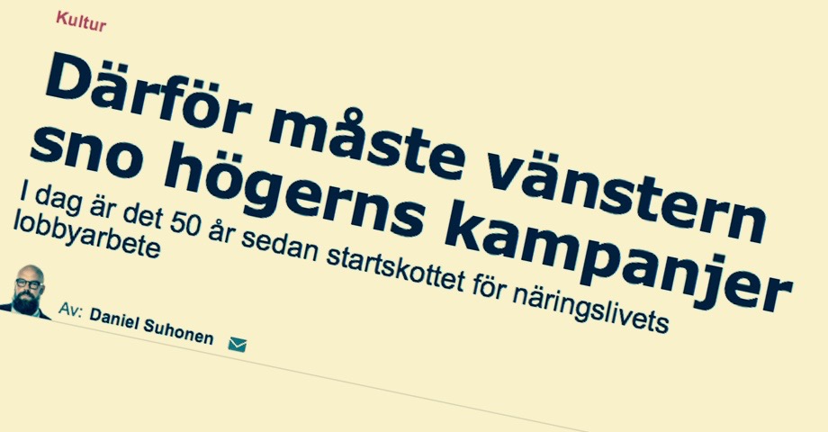”Egentligen hade näringslivets politiska kampanjverksamhet pågått ungefär lika länge som den organiserade arbetarrörelsen funnits”, skriver Daniel Suhonen i Aftonbladet (18/3) en till essä förklädd pitch på pengar till den egna tankesmedjan.