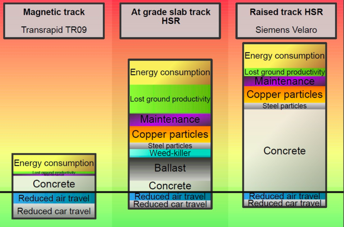 Enligt figuren ger det ekologiska fotavtrycket en dramatisk fördel för magnettåget. Det är minst fem gånger så hög miljöbelastning för höghastighetståg jämfört med magnettåget. Även om det skulle finnas någon avvikelse i de data som finns i figuren är dessa uppgifter en mycket stark indikation på att en sådan analys inte kan exkluderas i en seriös utredning.