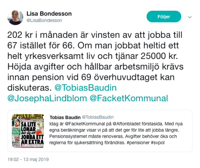 Även pensionssystemet kräver allt fler arbetsår för mycket lägre ersättningsgrad än tidigare, samt har en broms som kan sänka pensionen ytterligare om löntagarnas inkomster utvecklas långsammare än pensionsutgifterna. Skillnaden mot att inte ha jobbat alls blir allt mindre. Och tjänstepensionerna blir allt viktigare, men ökar också inkomstklyftorna.