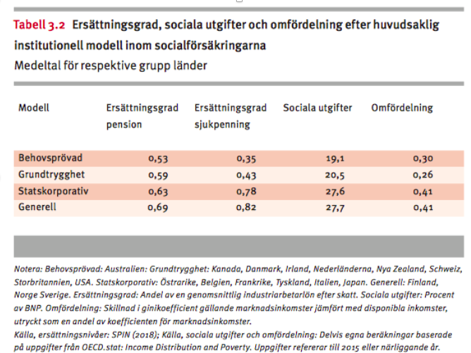En modell med generell välfärd, som i Sverige, Finland och Norge, omfördelar uppemot 60 procent (57, 7) mer än en modell med grundtrygghet, som i Kanada, Danmark, Irland, Nederländerna.