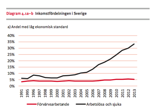 Medan andelen med låg ekonomisk standard sett till befolkningen som helhet fördubblades från 1995 till 2012, femdubblades andelen med låg ekonomisk standard bland sjuka och arbetslösa under samma period.