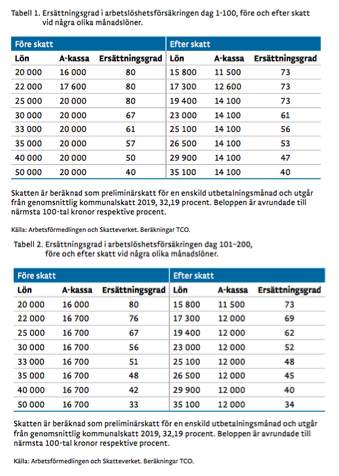 Senaste höjningen av nivån i a-kassan via den rödgröna regeringen 2015 var välbehövlig, men ger fortfarande för lite i förhållande till inkomst. TCO skriver i en färsk rapport att ersättningarna i arbetslöshets- och sjukförsäkringen i dag är så låga att en barnfamilj där ena föräldern blir arbetslös eller sjukskriven förlorar så mycket som en fjärdedel av sin inkomst efter skatt. Ersättningarna är fortfarande långt under 80 procent för flertalet inkomstgrupper och varierar från 73 till 34 procent.