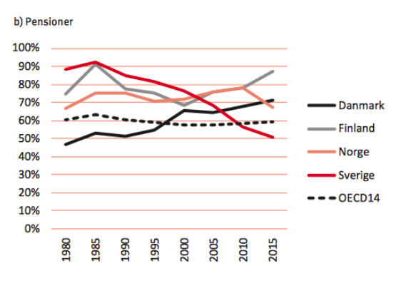 I mitten av 1980-talet fick en pensionär med en genomsnittlig industriarbetarlön en allmän pension som motsvarade över 90 procent av slutlönen. Tre decennier senare motsvarar pensionen strax över hälften av lönen. Motsvarande standardsänkning finns inte någonstans i övriga OECD, där genomsnittsersättningarna till pensionärer fortsatt ligger runt 60 procent. De andra nordiska länderna har bevarat ersättningsgrader som tydligt överstiger OECD-genomsnittet. I Danmark har den till och med stigit under perioden. I Finland har ersättningsgraden under 2000-talet återställts till nivåerna som rådde innan 1990-talskrisen.